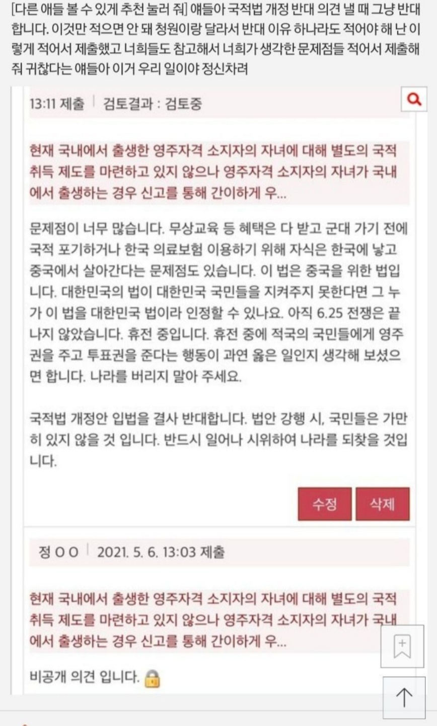 2021년 법무부에서 국적법 개정안 입법에 대한 논란에 관한 문서이다. 법무부와 보건복지부, 식품의약품안전처는 7일 이런 내용을 담은 관련 형법·모자보건법 개정안을 입법 예고했다. 국토교통부, '공동주택관리법 시행령·시행규칙' 개정안 확정. 관련 포스팅> 개인정보보호법 2차 개정안 살펴보기통신사와 시민단체 사이의 분쟁 가명정보의 처리에 관한 특례에 적용 예외 규정 관련하여 통신사와 시민단체가 분쟁을 이번 블로그 포스팅에서는 주요 2차 개정안 내용에 대해 좌담회에서 어떠한 논의가 오고갔는지 알아보도록 하겠습니다. '자유 민주적 기본질서'를 위태롭게 하는 반국가 단체의 활동을 규제하기 위해 만들어 진 법. 개정안 내용을 잘 모르시는 것 같은데. Kmda는 이날 성명서를 통해 이번 개정안 입법 추진에 대해 유감을 표하면서 대리점이 지급할 수 있는 추가 지원금 한도를 15%에서 30%로 상향하는 것은 30%까지 차별을 인정하는 것이라면서 현행 추가 지원금 15%도 지급할 여력이 없는 자금력 부족한 중소 유통망의 붕괴가 예상된다라고 주장했다. 국적법 공청회가 2시에 열림이게 뭐냐면영주권자 자녀에게 한국국적을 주자는 거임대상자중 95%가 중국인 ㅋㅋㅋㅋㅋ우리나라 법관련 공청회인데 패널로 extra form. 정의당도 정부안에 대해 반대 입장을 냈습니다. 저거 공청회가 웃긴게 반대 하는 새끼가 단 한명도 없음 ㅋㅋㅋ. 새로운 국적법 개정에 따른 혜택은 결국 짱궈들을 위한거라고 할 수 있지. 국토부, '주택법 시행령' 개정안 국무회의 통과. 법무부는 지난달 26일 한국 영주권을 지닌 외국인의 미성년 자녀가 한국 국적을 쉽게 취득할 수 있도록 하는 내용의 국적법 개정안을 입법 예고했다.